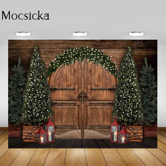 Christmas Trees Winter Backdrop for Photography Vintage Rustic Wooden Door Lamp Background Xmas Portrait Cake Smash Photo Shoot