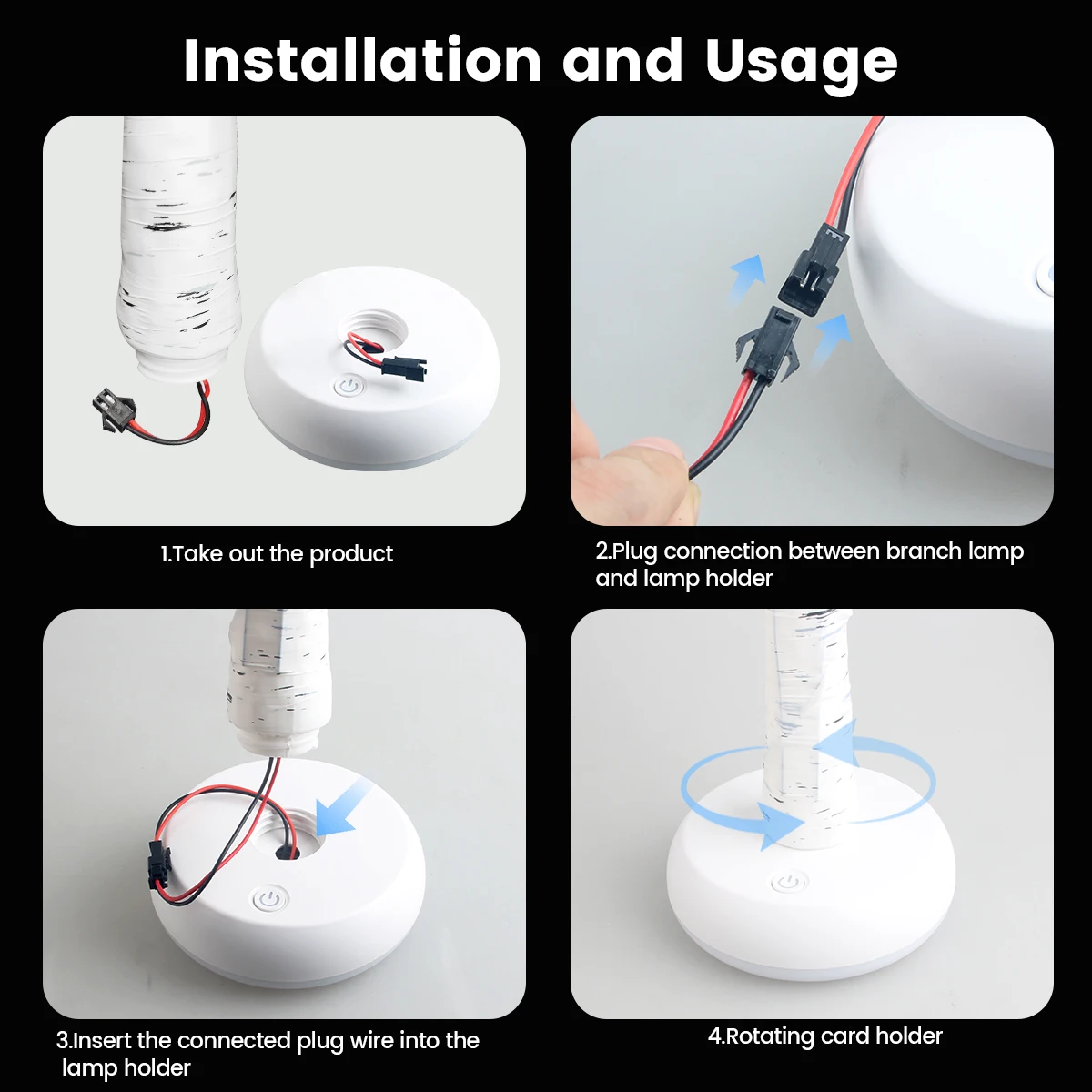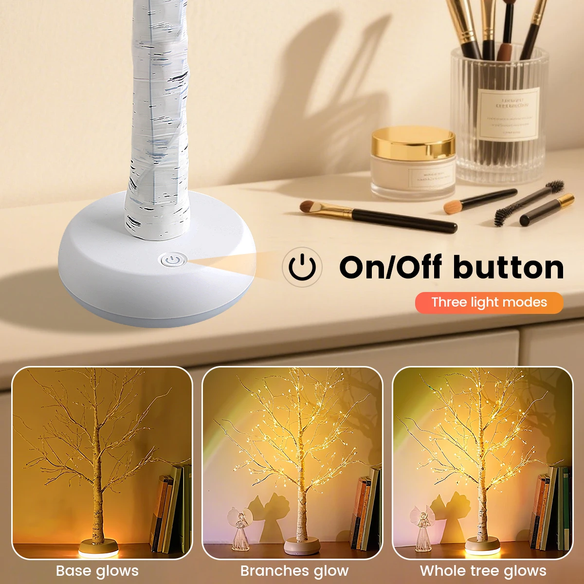3. Lighting function: There is a switch button on the base of the birch lamp. Press and hold the button for 2 seconds to turn on the power, and all lights will light up; Afterwards, press the button once to turn off the base light, and press the button again to turn off the tree light. Press the button again, the base light will turn on, and press the button again, the tree light will turn on. Press and hold the button for 2 seconds in any mode to turn off the power and extinguish all lights. Larger and bigger LED bulbs, brighter than other birch lights.