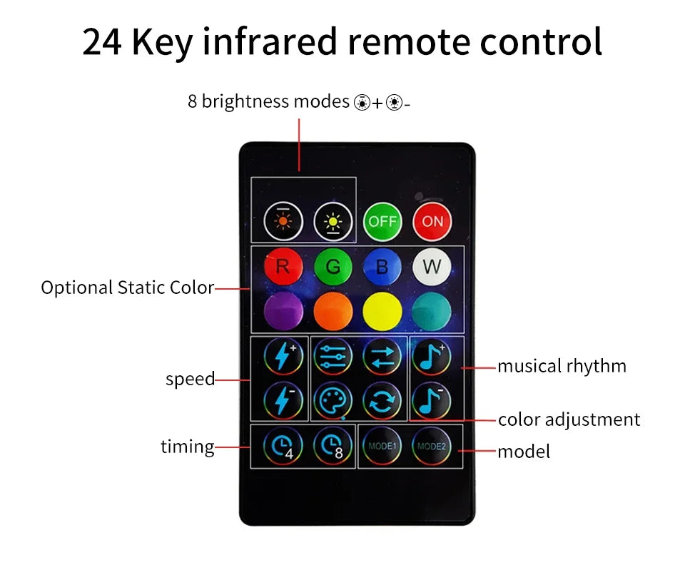 3 ways to control the color: IR remote, bluetooth APP, USB button.
